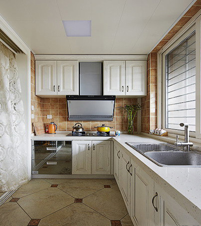 寬敞明亮的廚房。復(fù)古的地中海風(fēng)地磚與櫥柜顯出清爽,側(cè)吸的油煙機(jī)黑色板面時(shí)尚大氣。