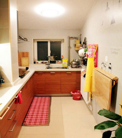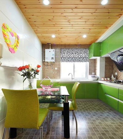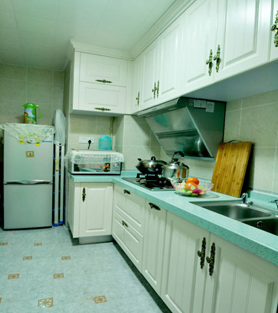 開放式的廚房能節(jié)省不少空間,蘋果綠色很漂亮,桌靠墻擺放 留出的過(guò)道恰恰好。