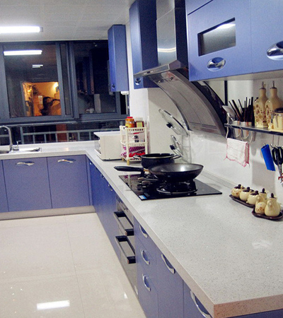 其實(shí)白色的吸塑櫥柜與藍(lán)色的石英石臺(tái)面,結(jié)合得相當(dāng)美。