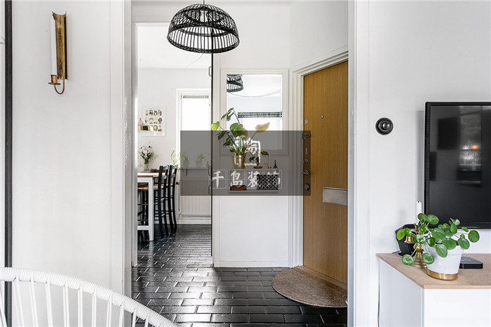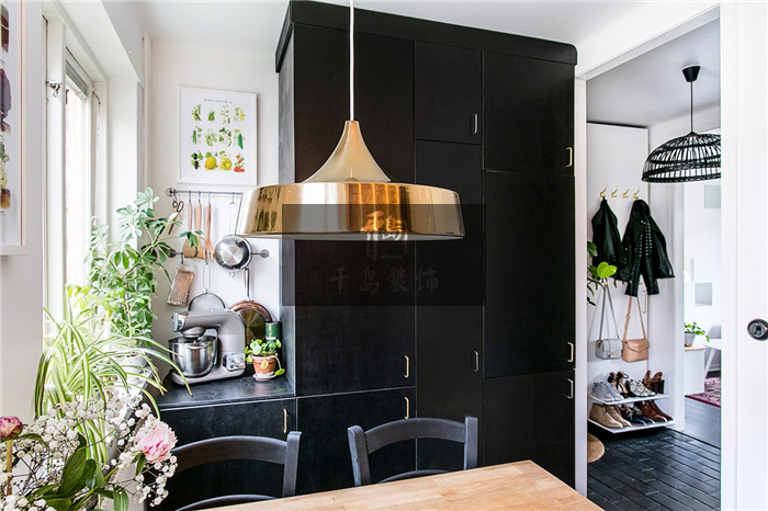 浴室在餐廳與客廳之間,為了避免中間的通道過于單調(diào),屋主在頂部設(shè)計了一盞鐵藝吊燈,寬大的燈罩搭配鏤空的線條,能夠恰到好處地充盈空間,又不會顯得過于笨重。純黑的色澤與黑色磚面相互映照,又與白色墻面相互對比,無處不產(chǎn)生碰撞的美感。