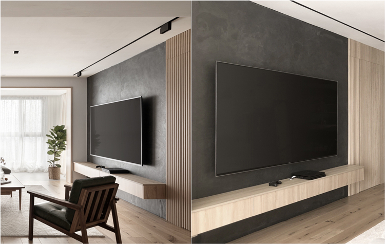 深灰色石材薄板做為電視背景墻,簡約大氣,搭配原木色格柵板,溫潤木質(zhì)與高級(jí)灰的搭配,讓人感到溫馨和放松。