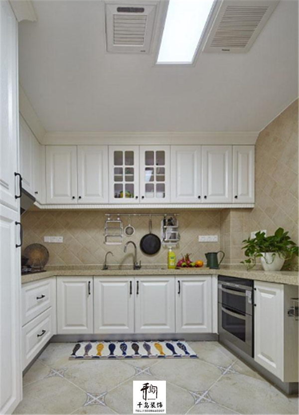 廚房是U型的設(shè)計(jì),櫥柜也是很多啊,這么一來廚具餐具都不愁沒地方放了!