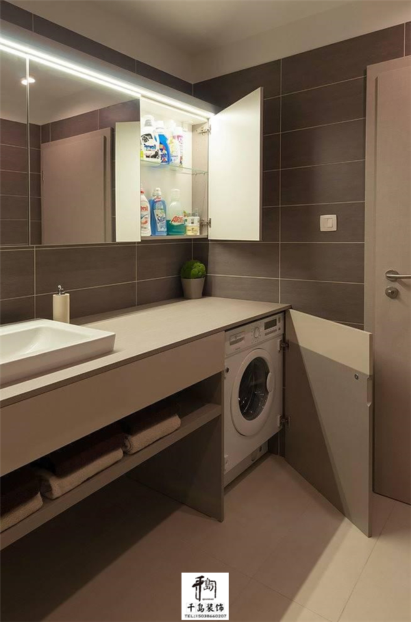 小戶型的衛(wèi)浴間比較小,而且還和臥室相連,衛(wèi)生間里的物品十分的多,像洗衣機(jī)這樣的大型電器一定要想好位置放置,所以衛(wèi)浴的收納變得尤為重要,整齊的收納隔柜,讓毛巾和家中的瓶瓶罐罐都有了容身之所,十分的貼心。