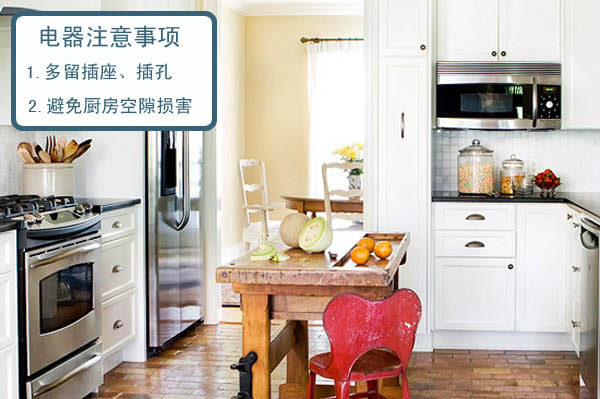 通常擺放在廚房的電器很多,冰箱、微波爐、烤箱、洗碗柜有時(shí)候也將熱水器放置在廚房中。這樣廚房的電壓就比較大,在廚房裝修注意事項(xiàng)中一定注意此項(xiàng),裝修時(shí)應(yīng)預(yù)留多的插孔。