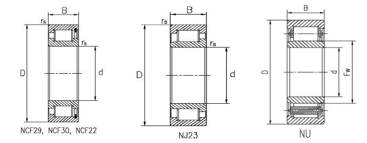 滿裝圓柱滾子軸承是為了承受重載荷而設(shè)計(jì)的。在同樣寬度下,這種軸承與傳統(tǒng)型帶保持架軸承相比,具有極高的承載能力,徑向截面小,可以節(jié)省空間,但轉(zhuǎn)速相對(duì)較低。為了使軸承正常工作,在連續(xù)運(yùn)轉(zhuǎn)的情況下,軸承必須承受一定的最小負(fù)荷,即C/P<25。否則因潤(rùn)滑不足和高速運(yùn)轉(zhuǎn)時(shí)會(huì)加劇磨損。所有多列圓柱滾子軸承在外圈上有一潤(rùn)滑槽和潤(rùn)滑孔。