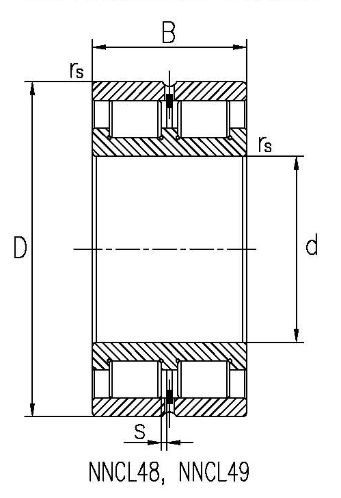滿裝圓柱滾子軸承是為了承受重載荷而設(shè)計(jì)的。在同樣寬度下,這種軸承與傳統(tǒng)型帶保持架軸承相比,具有極高的承載能力,徑向截面小,可以節(jié)省空間,但轉(zhuǎn)速相對(duì)較低。為了使軸承正常工作,在連續(xù)運(yùn)轉(zhuǎn)的情況下,軸承必須承受一定的最小負(fù)荷,即C/P<25。否則因潤滑不足和高速運(yùn)轉(zhuǎn)時(shí)會(huì)加劇磨損。所有多列圓柱滾子軸承在外圈上有一潤滑槽和潤滑孔。