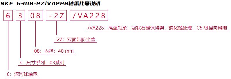 后綴列表:【-2Z:雙面帶防塵蓋】【/VA228:高溫軸承,冠狀石墨保持架,磷化錳處理,C5 級徑向游隙】。