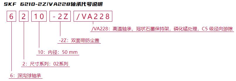 后綴列表:【-2Z:雙面帶防塵蓋】【/VA228:高溫軸承,冠狀石墨保持架,磷化錳處理,C5 級徑向游隙】。